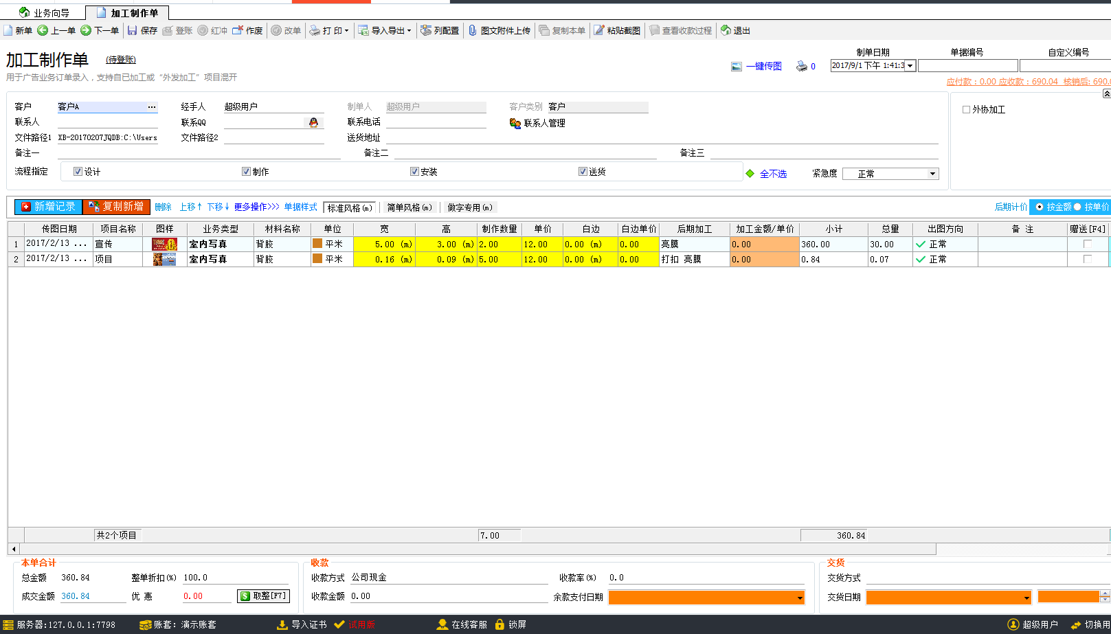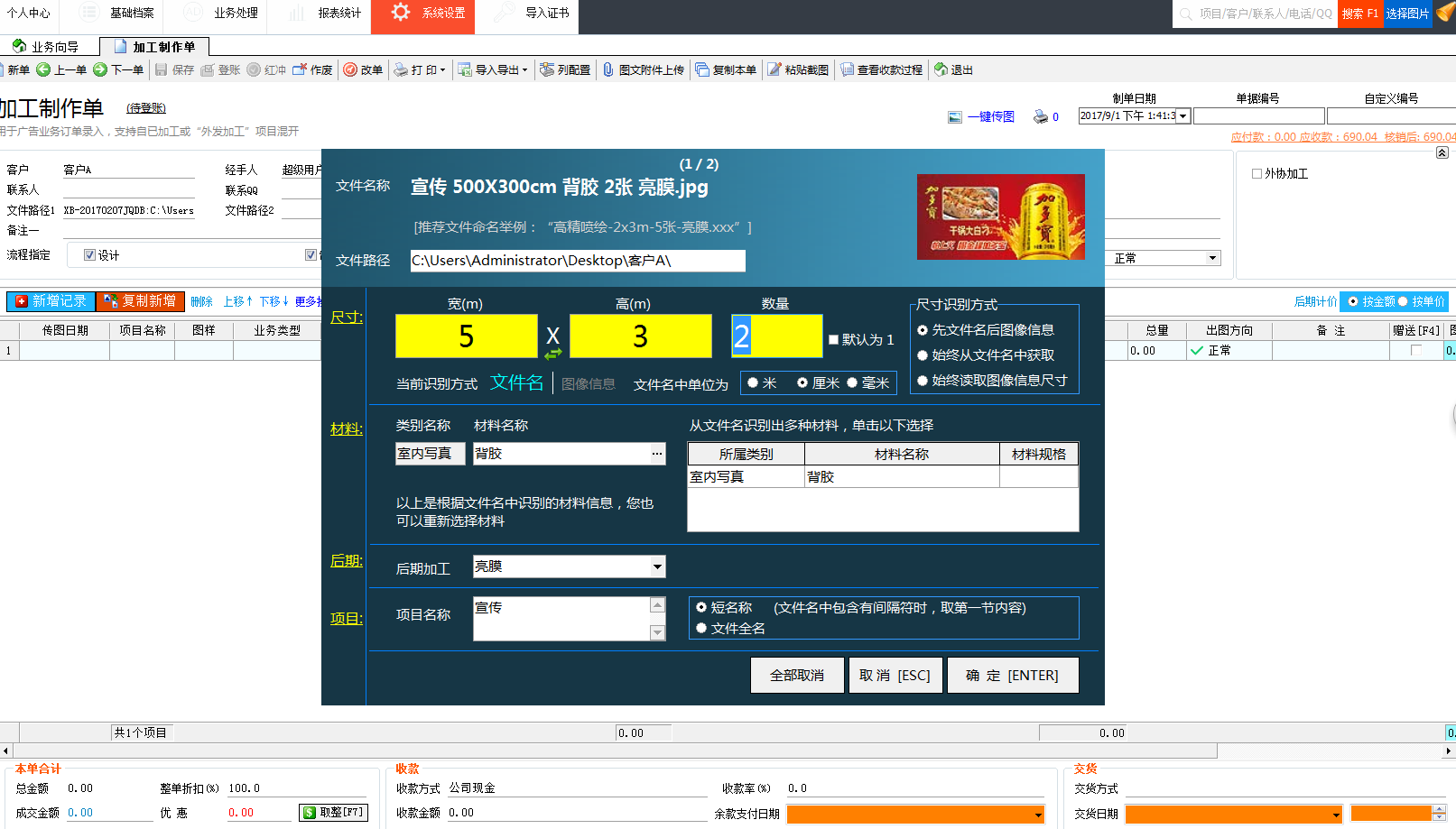 1.快速開單為廣告公司的業(yè)務(wù)員提供了快速開單的功能,拖動(dòng)圖片到軟件,軟件可以自動(dòng)識(shí)別圖片中的信息,包含項(xiàng)目名稱(制作內(nèi)容)、材料名稱、寬、高、制作數(shù)量以及后期加工等信息,材料單價(jià)此前已經(jīng)綁定,自動(dòng)顯示,所以整張單據(jù)都不需要再手動(dòng)去填寫相關(guān)的業(yè)務(wù)信息,廣告公司管理軟件就已經(jīng)自動(dòng)開好單據(jù)。保存登賬計(jì)入財(cái)務(wù)。