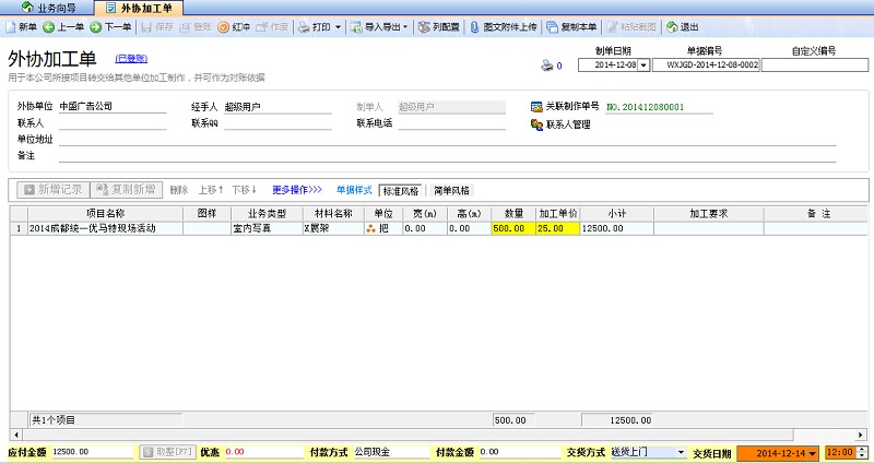 (2)在加工制作單完成以后,就把需要交給外協(xié)公司制作的外協(xié)單開(kāi)好,其中加工單價(jià)是可以給句外協(xié)單位給出的報(bào)價(jià)填寫,或者是直接填寫總價(jià)格。如下圖所示: