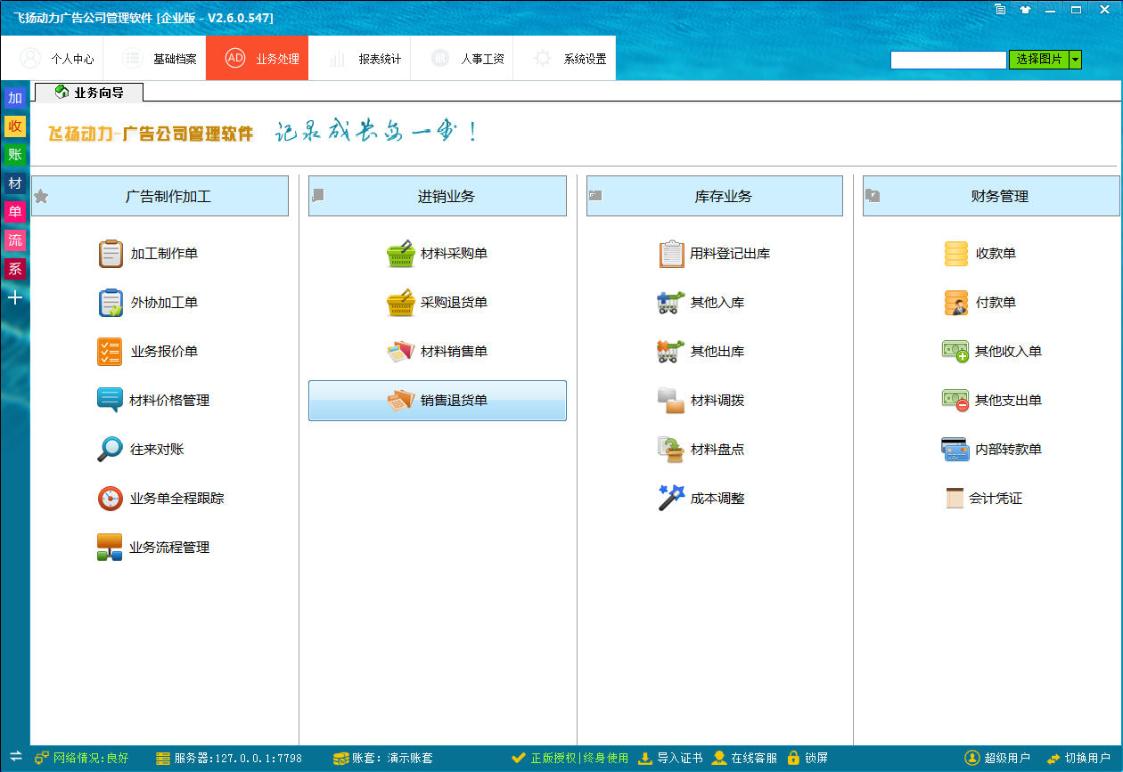 適合噴繪寫真條幅吸塑雕刻等各類中大型廣告公司,支持總部、分店聯(lián)網(wǎng),企業(yè)版是支持庫存管理(包括材料進貨單、進貨退貨單、材料銷售單、銷售退貨單、用料登記出庫單、材料調(diào)撥、材料盤點、成本調(diào)整、其他出入庫、庫存報警等),支持廣告財務(wù)管理(收款單、付款單、其他收入單、其他支出單、內(nèi)部轉(zhuǎn)賬單、會計憑證、資產(chǎn)負債表和損益表等),支持批量識別圖片,支持自定義計算公式,業(yè)務(wù)單全程跟蹤,業(yè)務(wù)流程管理,企業(yè)版是廣告公司業(yè)務(wù)、庫存、財務(wù)一體化的解決方案,客戶不用另外再購買財務(wù)軟件。