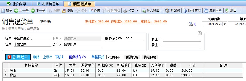 廣告公司在材料銷售過程中,如果遇到客戶需要退貨的時(shí),就應(yīng)該考慮把客戶退回的材料退回到那個(gè)倉庫,具體有哪些材料名稱,退回的數(shù)量,計(jì)價(jià)單位,退貨單價(jià)是多少等等,公司就應(yīng)該要有一套良好的退貨管理機(jī)制來處理這種情況。在飛揚(yáng)動(dòng)力廣告公司管理軟件企業(yè)版中,就可以讓廣告公司用戶使用銷售退貨單來管理整個(gè)退貨程序。