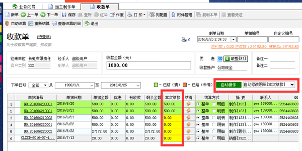 當(dāng)某一行的“剩余金額”與“本次結(jié)款”相等時(shí)則標(biāo)為結(jié)清狀態(tài),以綠色背景顯示。