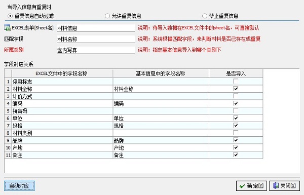 材料信息是可以按照Excel格式進(jìn)行導(dǎo)入導(dǎo)出的,而導(dǎo)出的格式是和材料信息管理界面中顯示的結(jié)果的格式一樣;而導(dǎo)入是需要選擇導(dǎo)出的材料信息Excel表,并且可以選擇需要對(duì)應(yīng)的字段,如圖3所示;