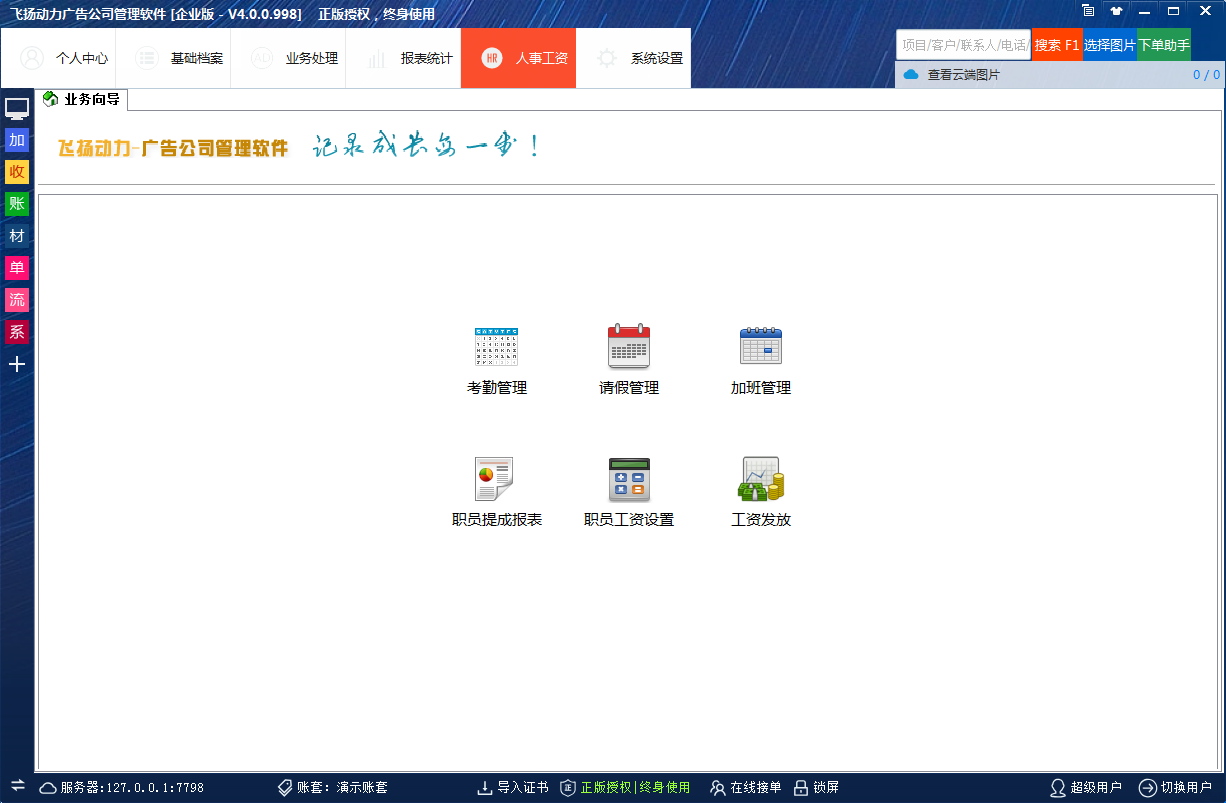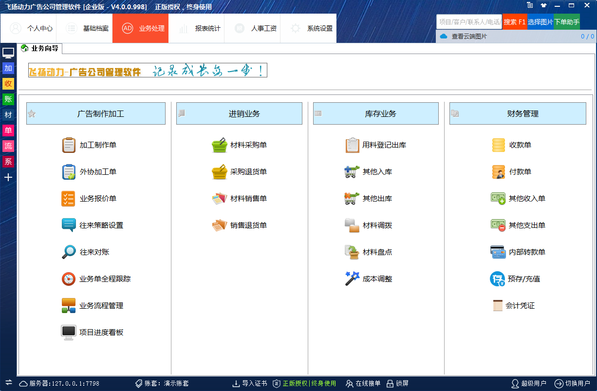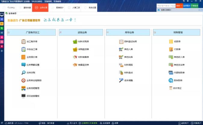 飛揚動力廣告公司管理軟件企業(yè)版集業(yè)務(wù)開單、外協(xié)加工管理、人事工資管理、業(yè)務(wù)流程管理、客戶管理、材料管理、往來策略(不同的客戶不同的價格)、業(yè)務(wù)單打印等多種管理功能為一體,適合中大型、連鎖型、集團型廣告制作企業(yè)。軟件通過將現(xiàn)代化企業(yè)管理理念同先進技術(shù)架構(gòu)相結(jié)合,打造一體化數(shù)字管理體系,幫助廣告企業(yè)提升工作效率,實現(xiàn)數(shù)字化運營,讓企業(yè)管理更加高效、便捷。軟件能規(guī)范業(yè)務(wù)訂單,減少錯單重噴降低材料消耗,提高生產(chǎn)效率,及時統(tǒng)計分析、財務(wù)盈虧狀況,是廣告制作公司提升核心競爭力的必備“武器”!